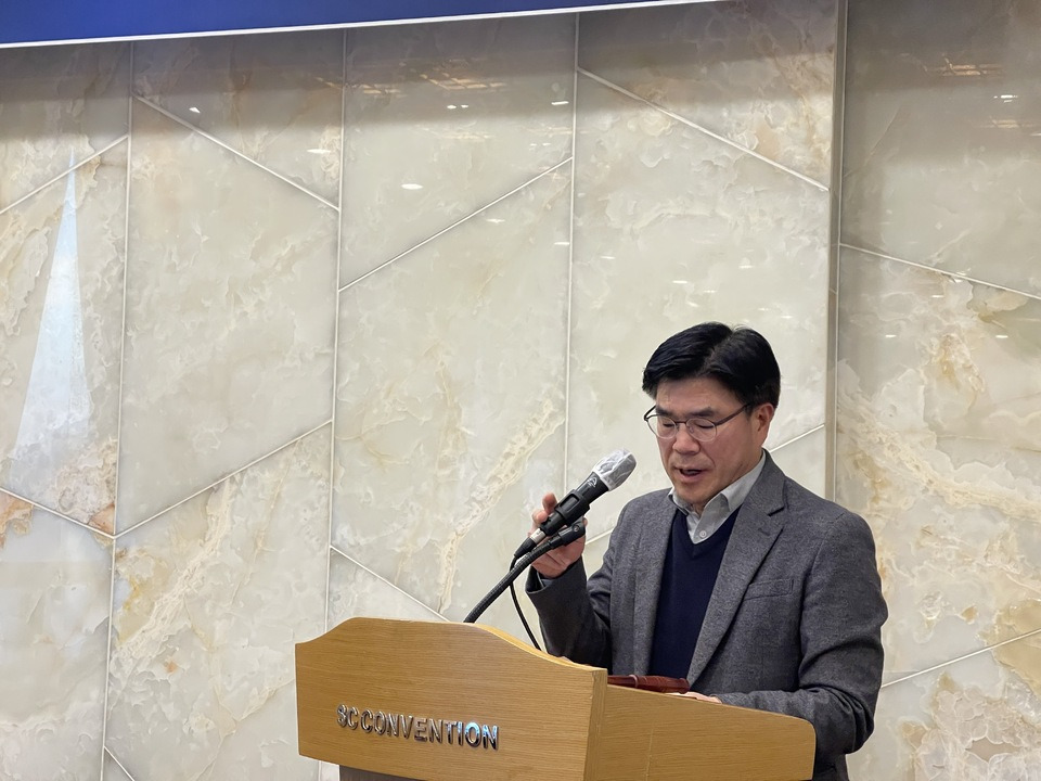 ▲차기 수석부회장에 선임된 최영진 한양대 교수가 인사말을 하고 있다.