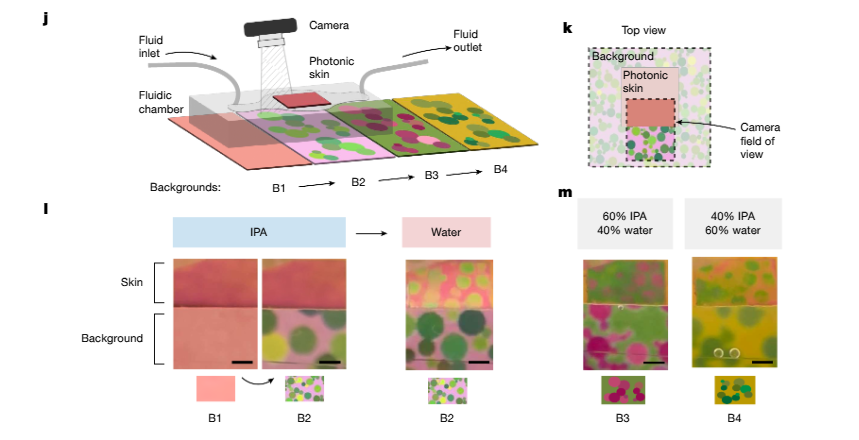 이 인공 피부는 색상과 질감을 담당하는 층을 이중으로 분리해 각각 독립적으로 제어할 수 있다. 수분이 닿으면 약 20초 이내에 미리 설계된 패턴으로 변하며, 마르면 원래 상태로 복원되는 방식이다. 알코올 화합물의 농도에 따라 5가지 이상의 색상 상태를 구현할 수 있으며, 표면 입자감을 조절해 주변 바위나 모래의 질감을 재현할 수 있다.