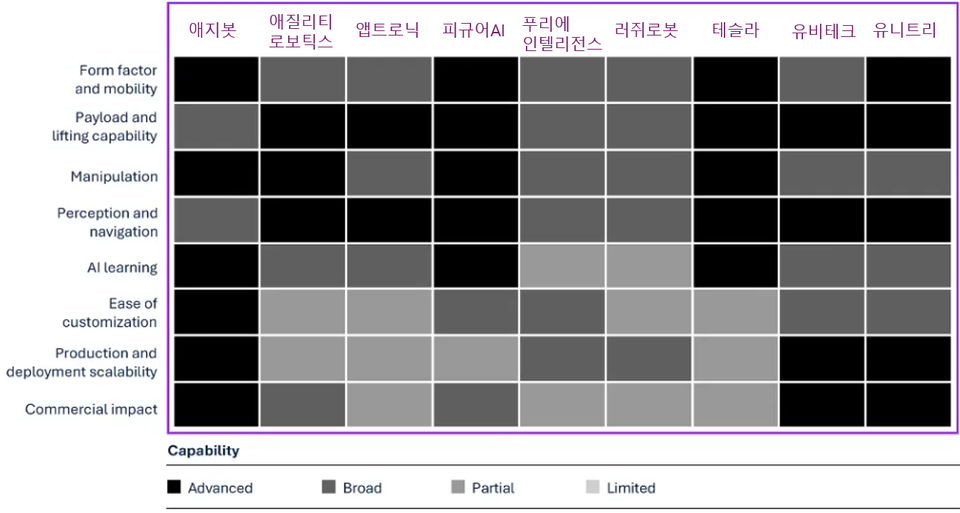 옴디아는 열지도(Heat Map) 모델을 활용해 글로벌 주요 업체들을 ▲제품 형태 ▲하중 성능 ▲정밀 조작 ▲인지·내비게이션 ▲AI 학습 ▲맞춤화 용이성 ▲대량 양산 ▲대규모 상용화 등 8개 항목에서 종합 평가했다.