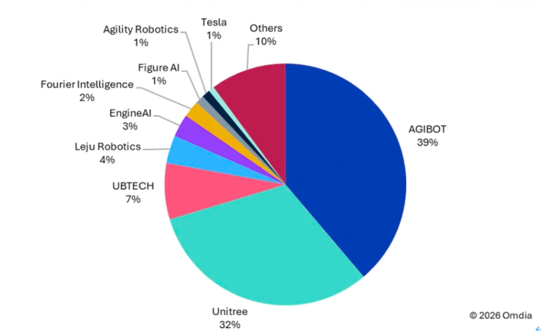보고서에 따르면, 중국 로봇 기업들이 전반적으로 글로벌 시장을 선도하고 있으며, 애지봇(AgiBot, 智元机器人)이 2025년 출하량과 시장점유율 모두에서 세계 1위를 차지했다. 이어 유니트리(宇树)가 2위, 유비테크(优必选)가 3위에 올랐다.