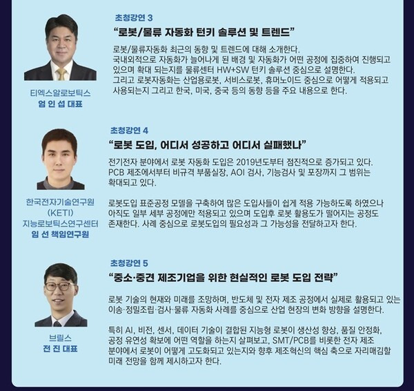 한국전자기술연구원(KETI) 임선 책임연구원은 '로봇 도입, 어디서 성공하고 어디서 실패했나'를 주제로, 전기전자 제조 현장에서의 로봇 도입 성공 및 실패 사례를 분석해 로봇 자동화 전략 수립에 필요한 시사점을 제시할 예정이다.