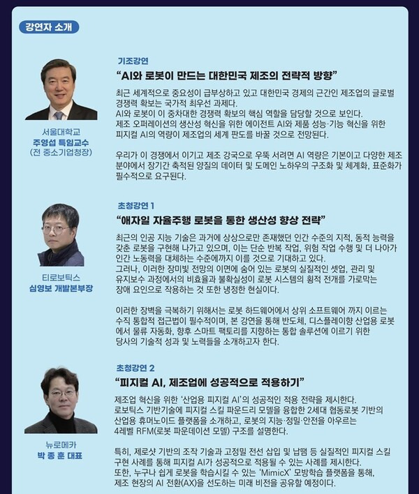 행사는 서울대학교 주영섭 특임교수(전 중소기업청장)의 기조 강연으로 시작된다. 주 교수는 ‘AI와 로봇이 만드는 대한민국 제조의 전략적 방향’을 주제로, 제조 경쟁력 확보를 위한 에이전트 AI와 피지컬 AI의 역할을 설명하고 제조 데이터와 도메인 노하우의 체계화 중요성을 강조할 예정이다.