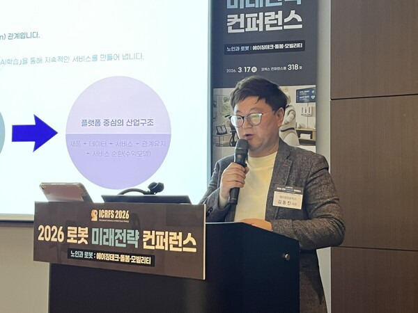 김동진 제이엠로보틱스 대표는 로봇신문이 서울 삼성동 코엑스 컨퍼런스룸에서 개최한 ‘2026 로봇미래전략 컨퍼런스’에서 ‘인공지능이 이해하는 돌봄’이라는 주제 강연을 통해 이같이 말했다. 김 대표는 “119·112만 연결하는 안전망에서 멈출 게 아니라, 가족·지인·종교 공동체까지 자연스럽게 이어지는 돌봄 플랫폼을 만들 때 진짜 생태계가 열린다”며 “정부가 제공하는 복지 기기가 아니라, 가족이 홈쇼핑에서 직접 사줄 만큼 가성비와 효용이 분명한 돌봄 로봇을 만들어야 한다”고 강조했다.