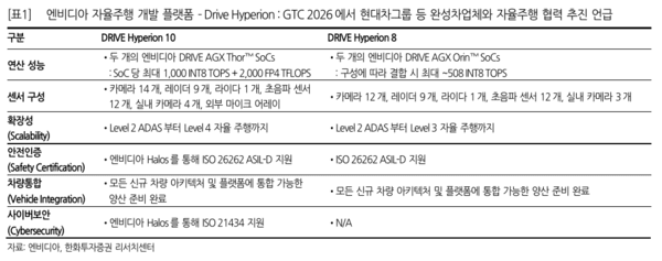 또한 엔비디아 드라이브 하이페리온이 '오토사르(AUTOSAR)'를 지원해 현대오토에버의 차량 SW 플랫폼 '모빌진'과 호환성을 유지할 수 있다는 점도 긍정적으로 평가했다.