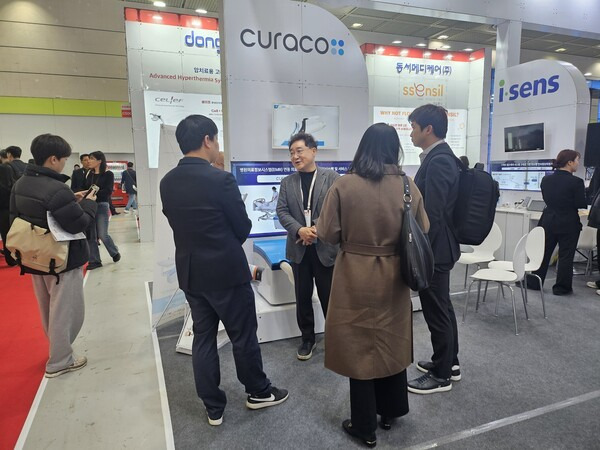 ▲20년간 단일 제품 개발에만 매진해 온 AI 배설케어로봇 전문기업 큐라코의 이호상 사장이 관람객들에게 대표 제품 ‘케어비데’를 소개하고 있다. (사진=로봇신문)