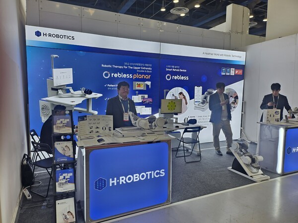 ▲로봇기술 기반 헬스케어 솔루션 개발기업 에이치로보틱스는 상지 재활 로봇 ‘리블레스(rebless)’를 선보였다. (사진=로봇신문)