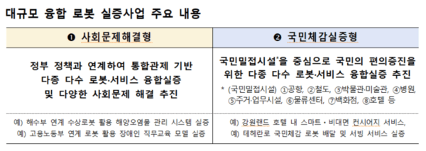 ‘대규모 융합 로봇 실증사업’은 다종 로봇과 통합관제 시스템을 기반으로 현장 중심의 융합 서비스 구현을 지원하는 사업이다. ▲사회문제해결형 ▲국민체감실증형 2개 유형으로 운영되며 사회문제 해결을 위한 공공 중심 실증과 국민이 체감할 수 있는 서비스 구현을 통해 다종 로봇 연동 및 통합 운영 기반을 확보할 계획이다.