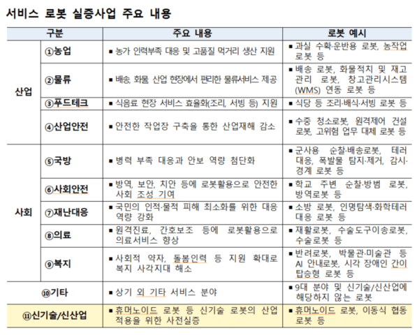 ‘서비스로봇 실증사업’은 공공 및 민간, 해외 수요처를 대상으로 로봇 도입과 활용 확산을 지원하는 사업이다. ▲공공확산형 ▲민간·지역 확산형 ▲해외실증형 3개 유형으로 운영되며 실제 산업 및 생활 현장에서의 서비스 로봇 적용을 통해 시장 확산 및 수요 창출을 촉진할 계획이다.