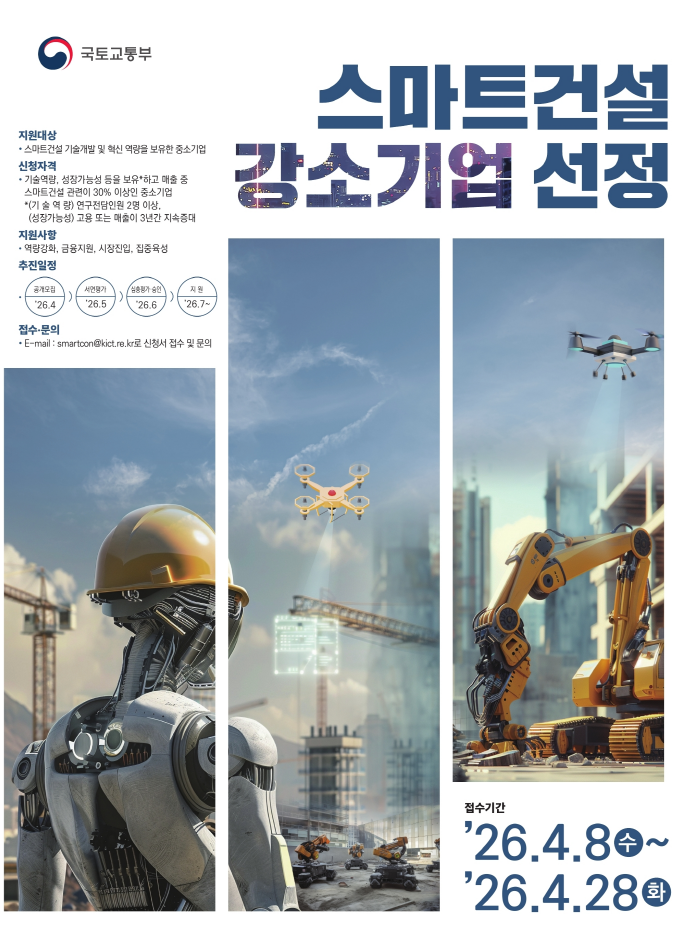 국토교통부와 한국건설기술연구원은 혁신적인 스마트건설 중소기업들을 육성하고 산업 생태계를 조성하기 위해 '스마트건설 강소기업 공모'와 '스마트건설 얼라이언스 기술실증 지원사업 공모'를 4월 8일부터 4월 28일까지 3주간 실시한다.