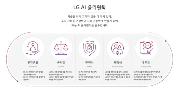 LG의 ‘AI 윤리원칙’ 5대 핵심가치는 ▲AI가 인간의 자율성과 존엄성과 같은 권리를 침해하지 않고, 인류에 긍정적인 가치를 제공할 수 있어야 한다는 인간존중 ▲AI가 성별, 나이, 장애 등 인간의 개인 특성에 기초한 부당한 차별을 하지 않고, 다양성을 존중하며 공정하게 작동할 수 있도록 하는 공정성 ▲ AI를 활용한 제품과 서비스를 접하는 고객들이 신뢰할 수 있도록 안전과 관련된 부분들은 글로벌 수준의 검증 시스템을 항시 가동한다는 안전성 ▲AI를 개발하고 활용하는 LG 구성원들이 주인 의식을 가지고 역할과 책임을 명확히 해야 한다는 책임성 ▲ AI의 알고리즘과 데이터 활용은 원칙과 기준에 따라 투명하게 관리하며, AI가 내놓은 결과를 고객들이 이해할 수 있도록 끊임없이 소통한다는 투명성이다.