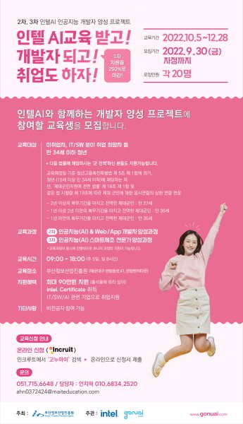 부산시가 글로벌 IT기업 인텔(Intel)의 인공지능(AI) 교육 커리큘럼을 활용한 의 교육생을 9월 30일까지 모집한다고 밝혔다.