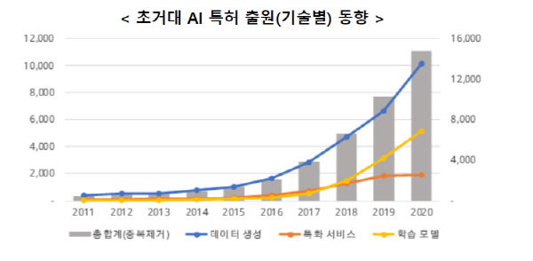 특허청에 따르면, 지식재산권 5대 주요국(IP5: 한·미·일·중·유럽)에 출원된 초거대 AI 관련 특허출원이 최근 10년(2011년~2020년) 사이 약 28배(2011년 530건 → 2020년 1만4848건, 연평균 44.8%) 증가한 것으로 나타났다. 특히, 최근 5년(2016년~2020년)간은 연평균 증가율 61.3%로 출원 증가 속도가 더욱 빨라졌다. 2016년의 알파고 충격 이후 AI에 대한 연구가 활발해진 결과로 보인다.